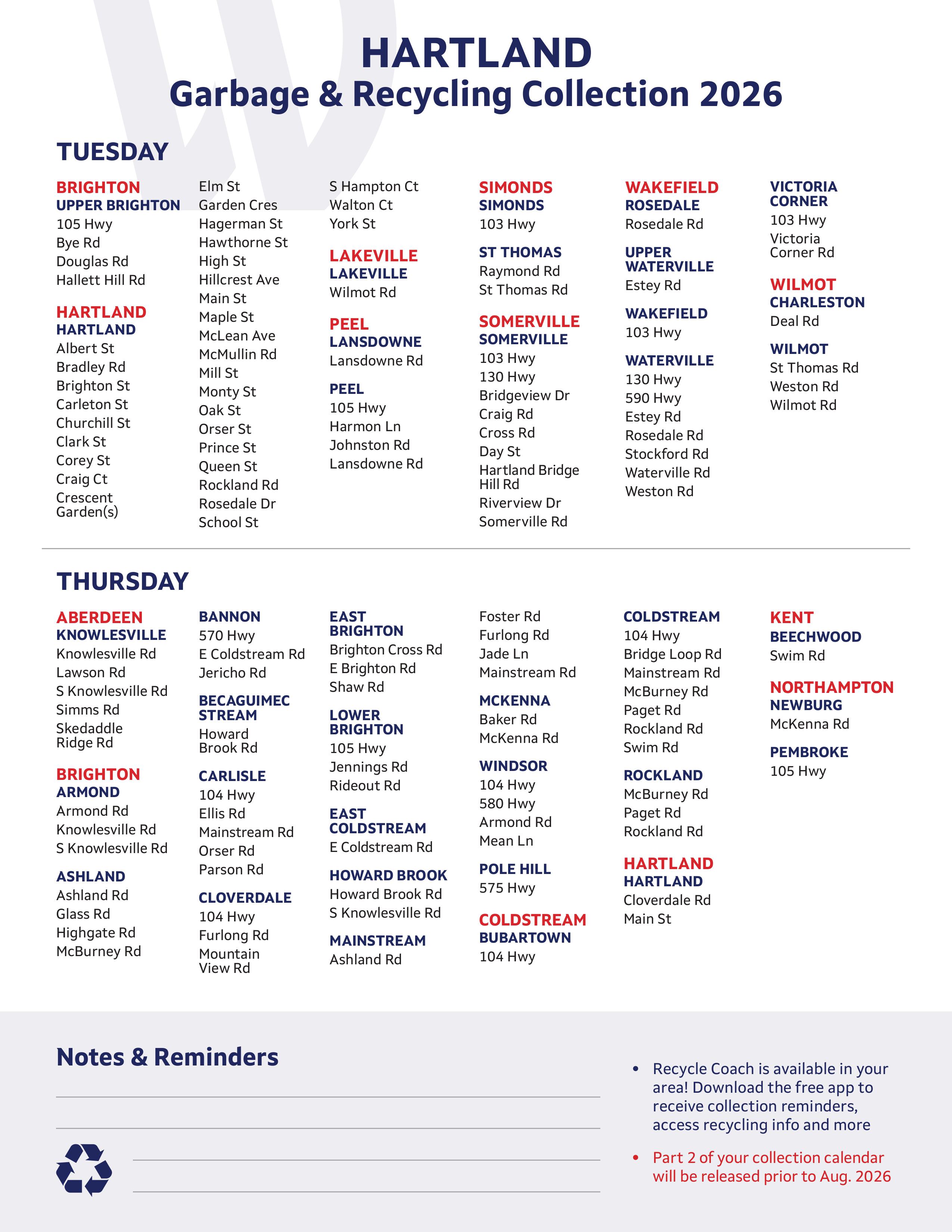 Please note that some of these communities are spread over multiple municipalities, so the above schedule should only be used for communities in the municipality of Hartland.